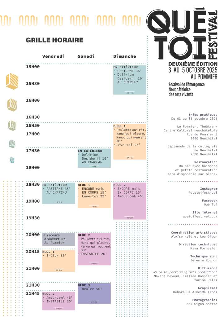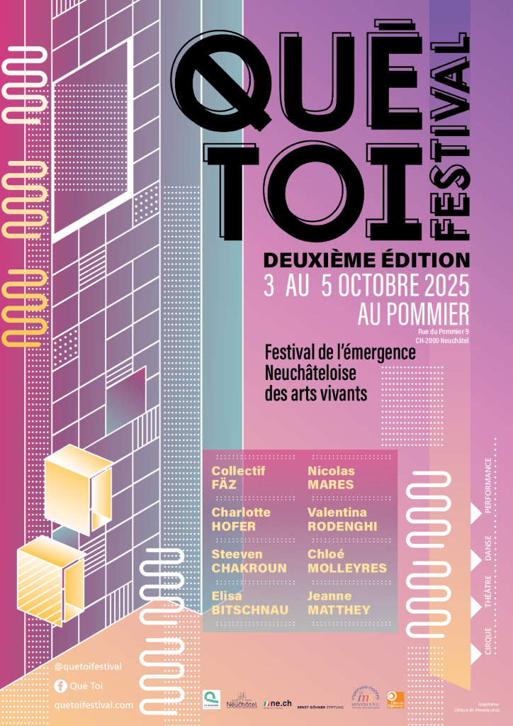 Le Qué Toi Festival a pour objectif de mettre en avant les artistes professionnel·le·x·s émergent·e·x·s des arts de la scène (théâtre, cirque, performance, danse) ayant grandi et/ou résidant dans le canton de Neuchâtel. Il vise à rendre visible, dans leur région, les projets personnels réalisés par ces artistes à la fin de leur formation professionnelle des arts de la scène.